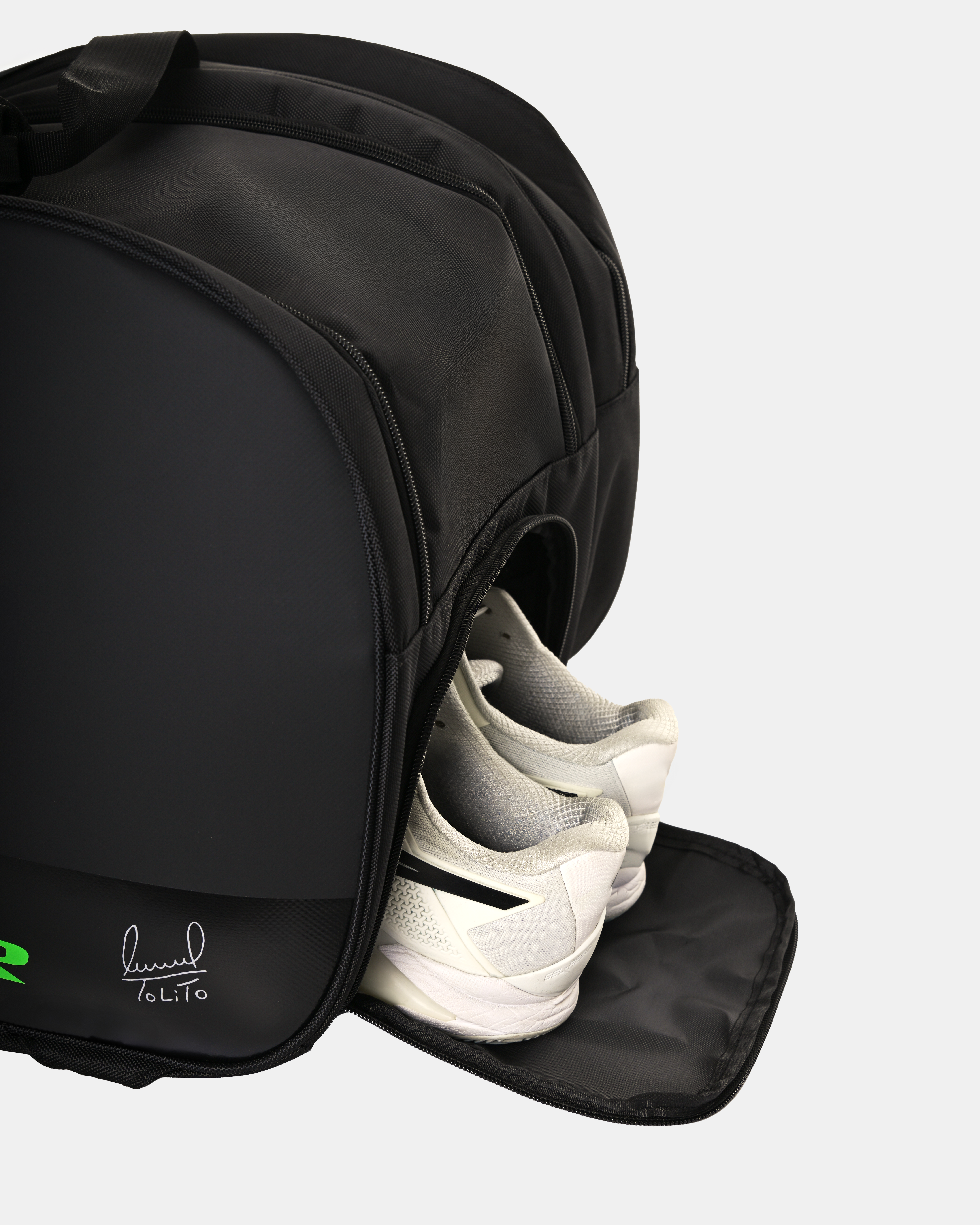 Si buscas el bolso que acompaña a Tolito Aguirre en cada torneo, este es el indicado. Funcionalidad, diseño y resistencia en un solo modelo. ¡Llevá tu equipo como un verdadero profesional!
